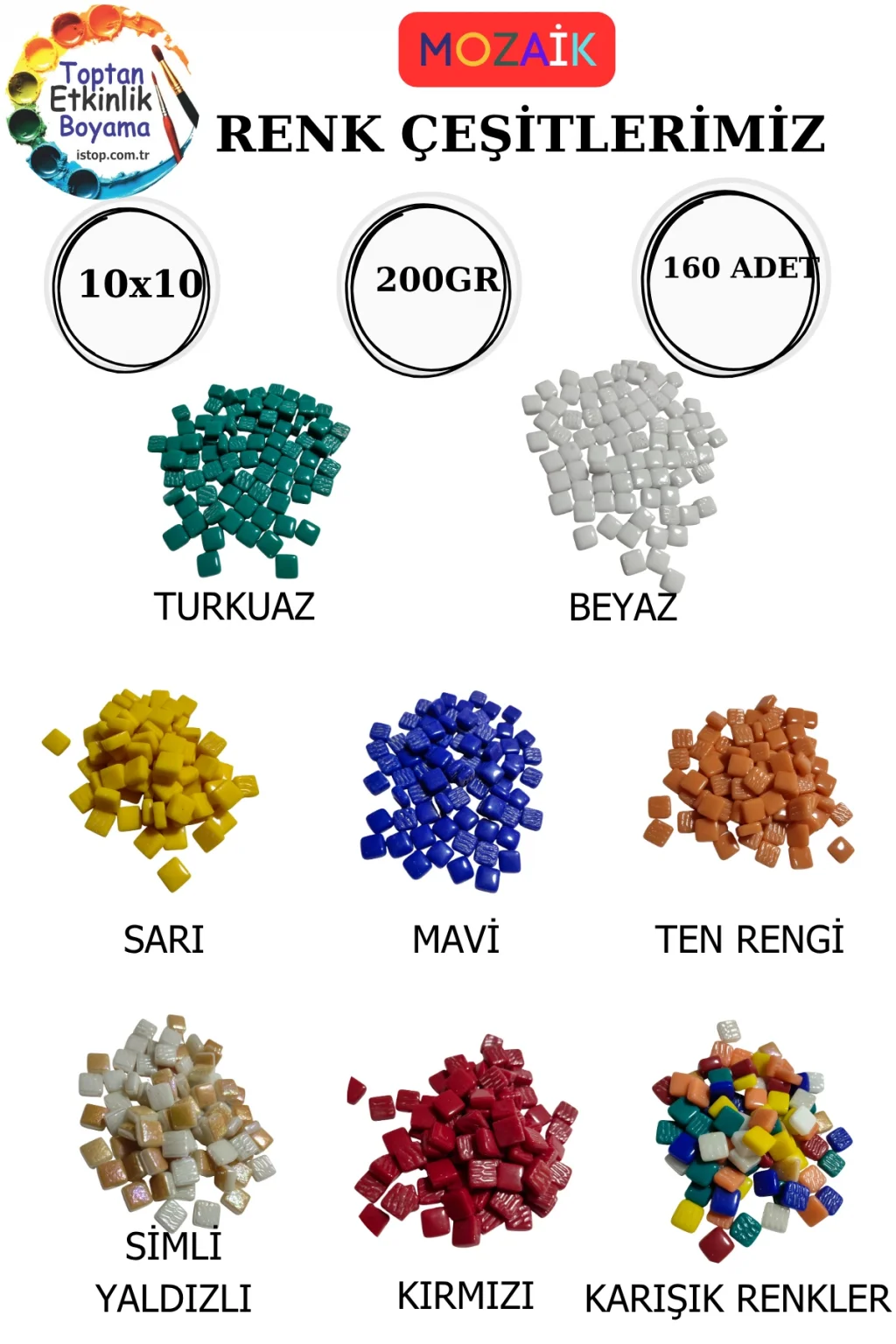 Bu Renkli Taş Mozaik Seti, MDF mozaik bazlarla uyumlu olacak şekilde üretilmiştir.