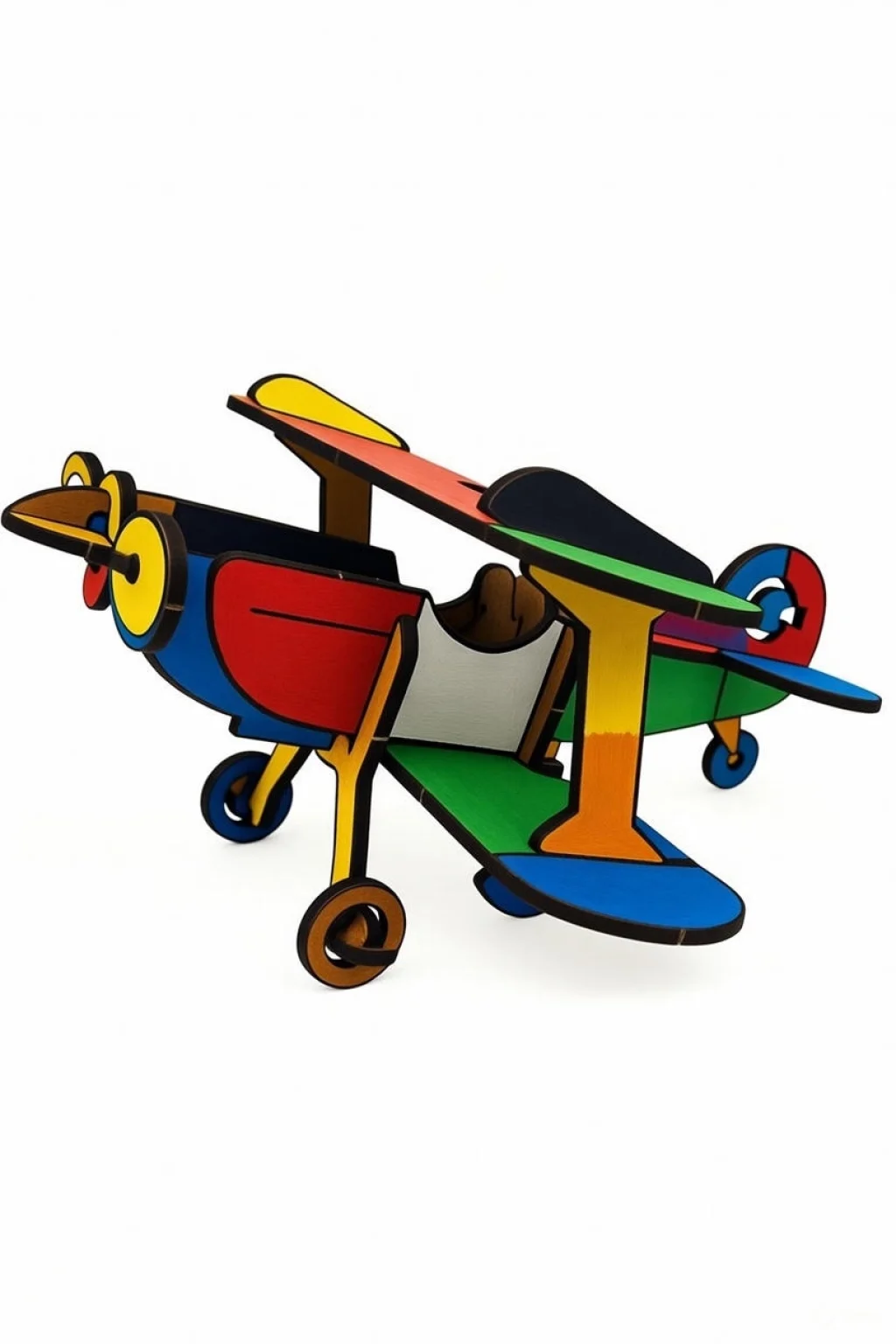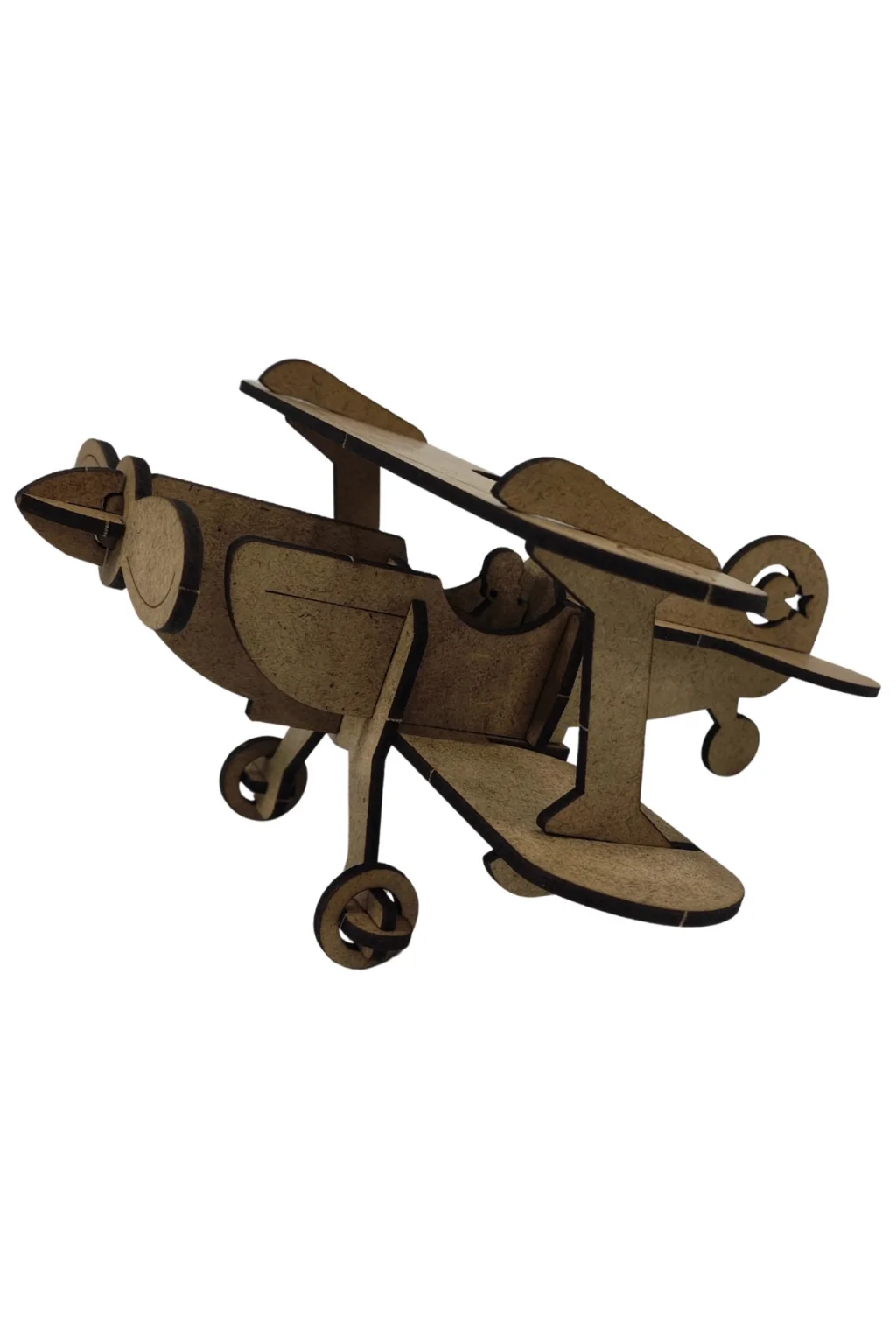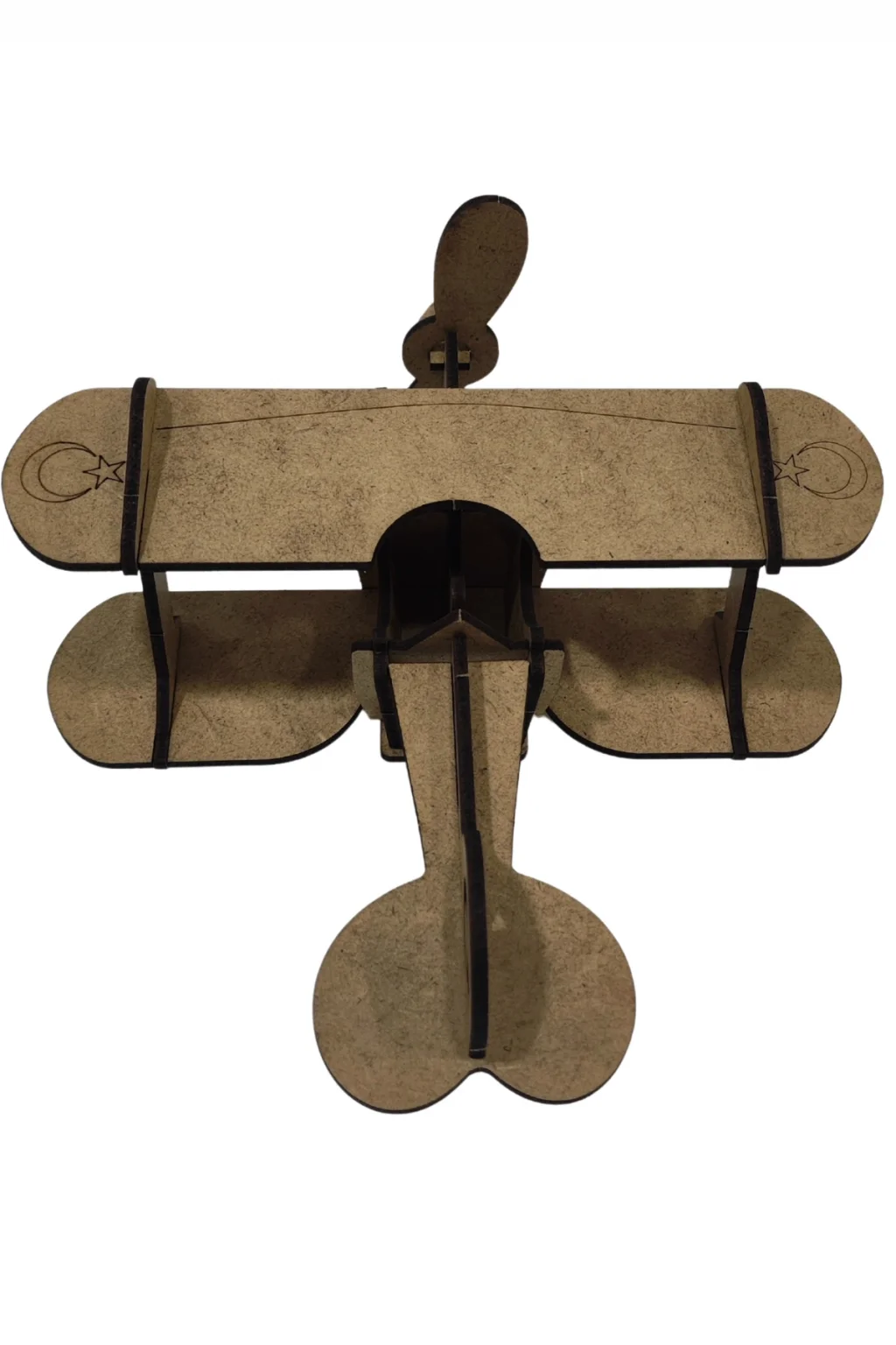 Lazer kesim MDF parçalar birleştirilerek oluşturulan uçak modeli, boyama sonrası dekoratif veya oyuncak olarak kullanılabilir.