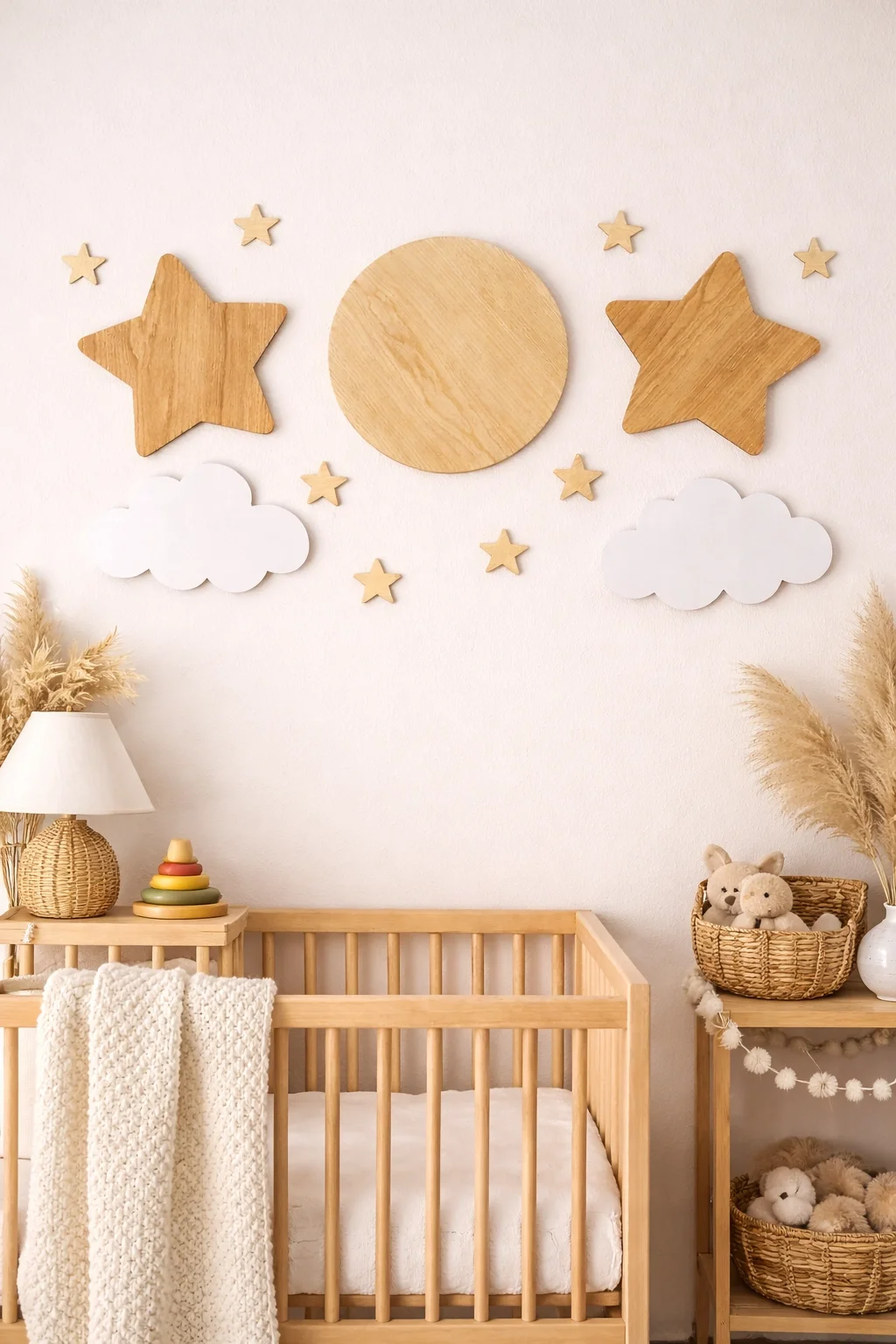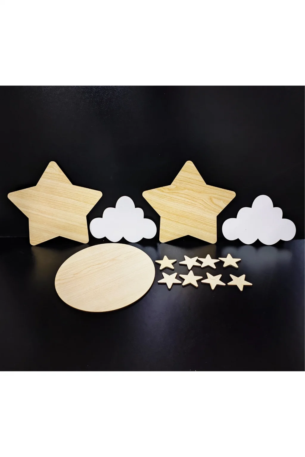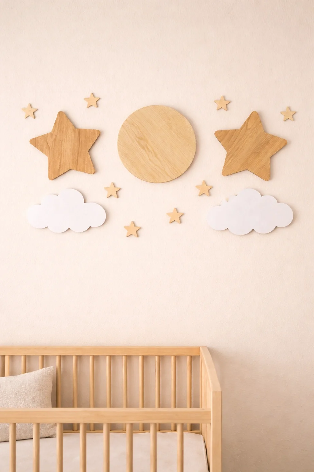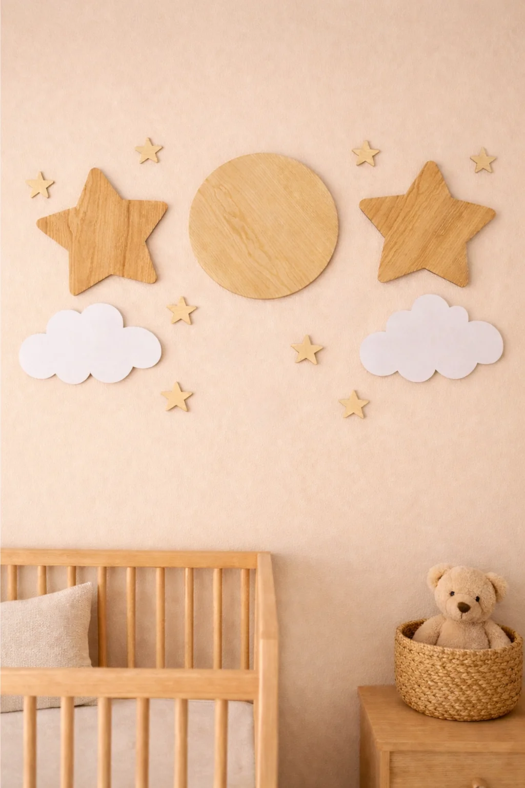 Ahşap Yıldız Ay Bulut Duvar Süsü Seti, bebek ve çocuk odaları için özel olarak tasarlanmış dekoratif MDF duvar süsü setidir.