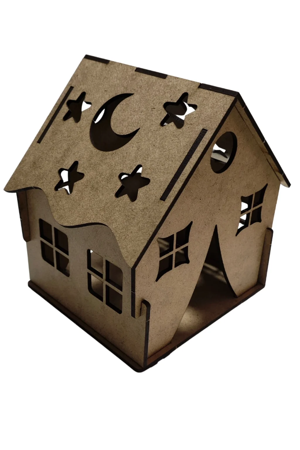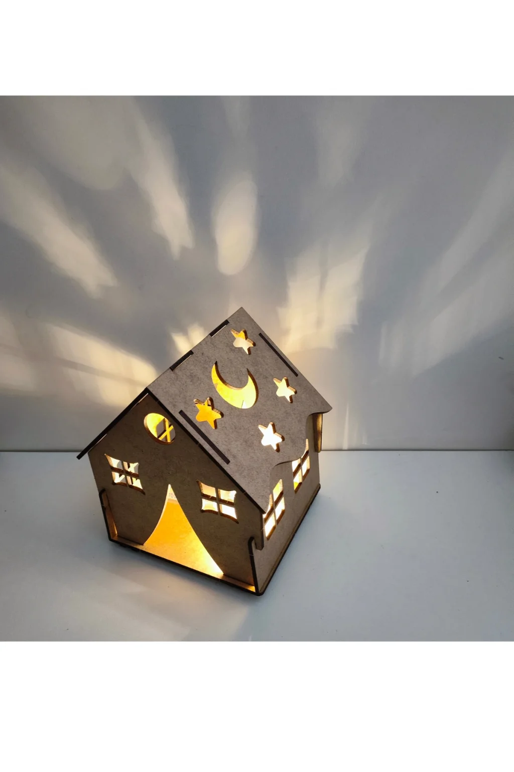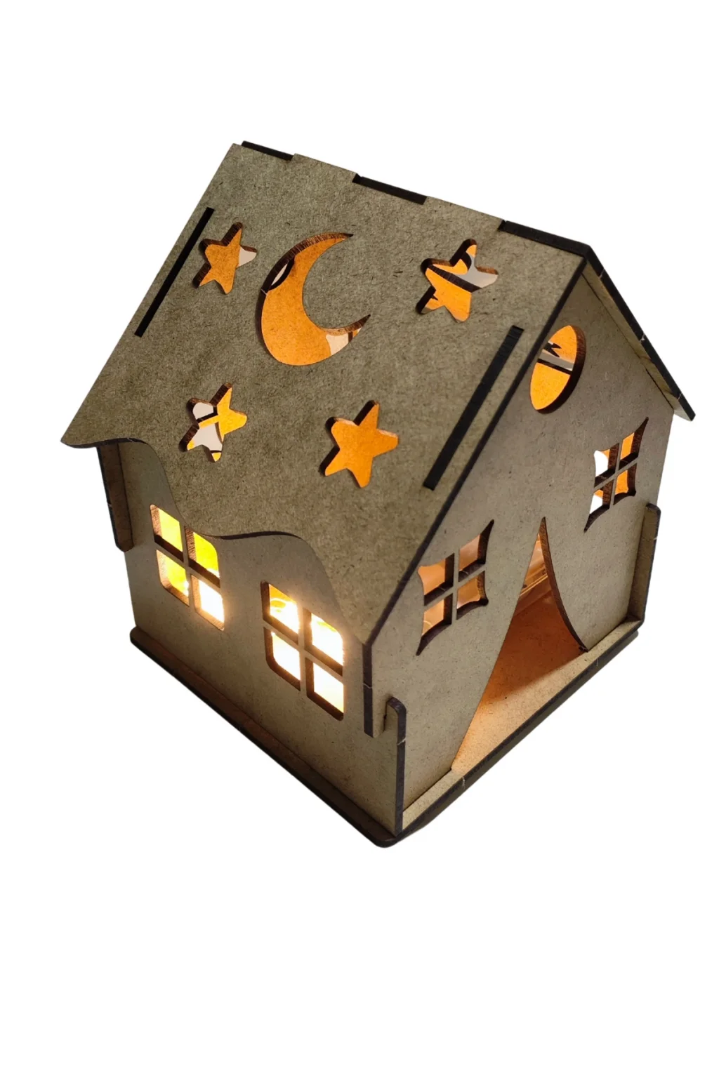 Dayanıklı MDF malzemeden üretilmiş ev formu, lazer kesim detaylarıyla birlikte gelir. Üzerindeki yıldız, ay ve pencere detayları sayesinde boyandıktan sonra LED ışık ile birlikte çok şık bir görünüme kavuşur.