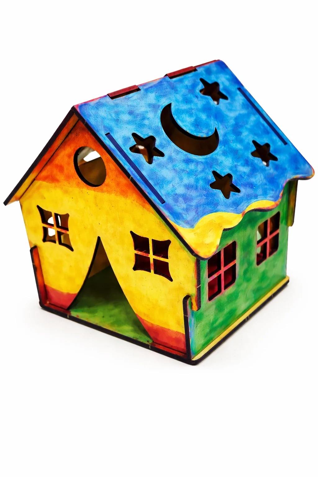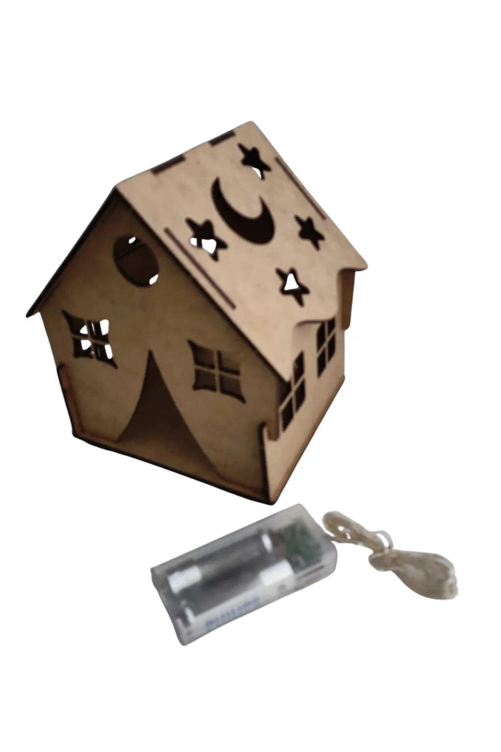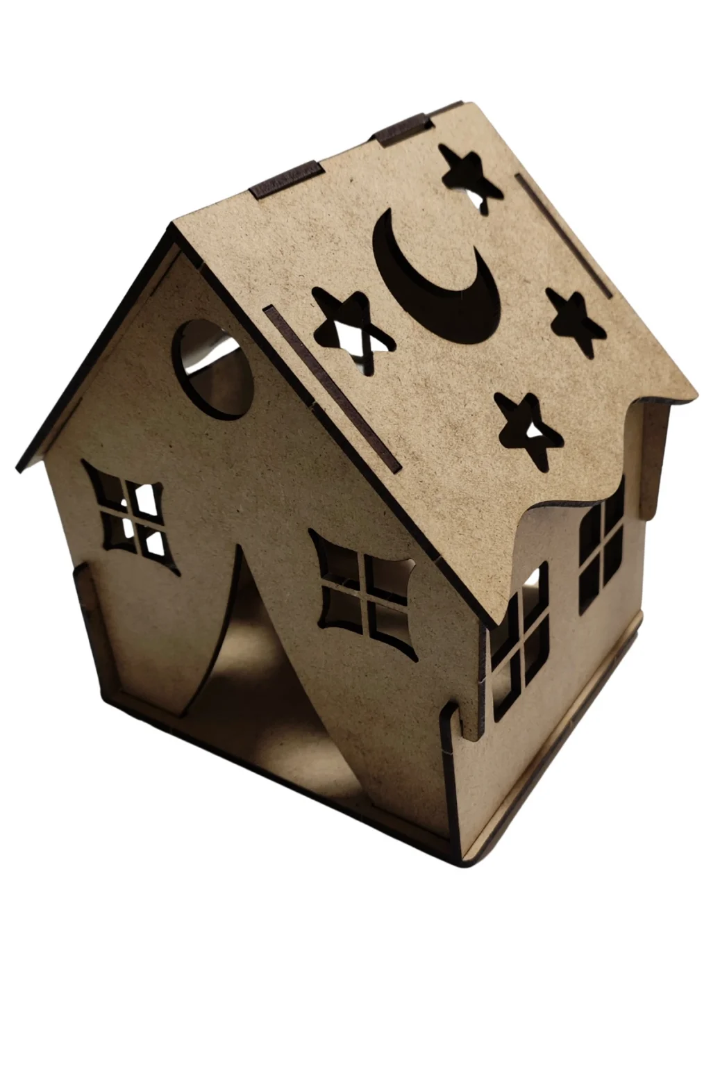 Dayanıklı MDF malzemeden üretilmiş ev formu, lazer kesim detaylarıyla birlikte gelir. Üzerindeki yıldız, ay ve pencere detayları sayesinde boyandıktan sonra LED ışık ile birlikte çok şık bir görünüme kavuşur.