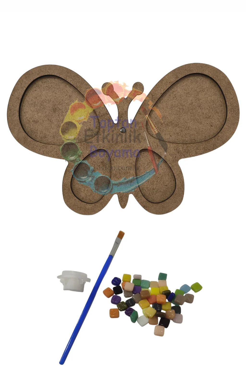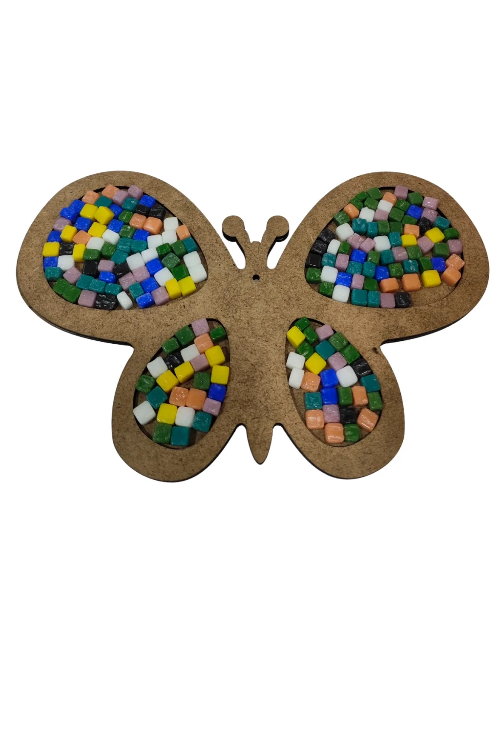 Kelebek Mozaik Yapma Seti, çocukların renkli taşlarla kendi tasarımlarını yapabilecekleri eğlenceli bir etkinlik ürünüdür. MDF taban üzerine yerleştirilen mozaik taşları ile kelebek figürü tamamlanır. Eğitici yönüyle çocukların ince motor becerilerini, dikkat gelişimini ve hayal gücünü destekler. Hem sınıf içi etkinliklerde hem de aile ile yapılacak keyifli aktiviteler için uygundur.